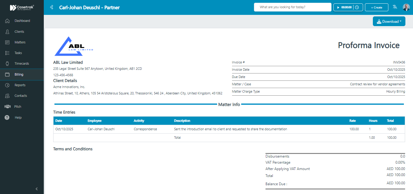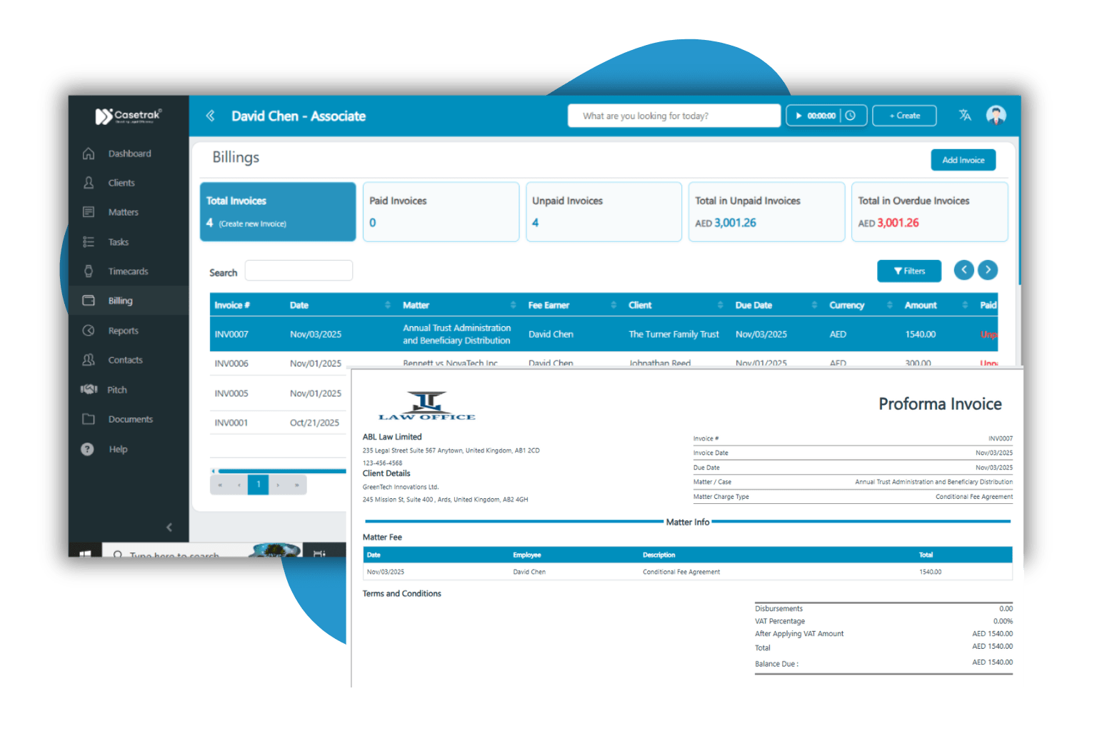 Casetrak simplifies legal billing by providing a user-friendly interface to create and send professional-looking invoices. Customize invoices to reflect your firm’s brand, track payment statuses, and manage billing efficiently, saving you time and ensuring accurate financial records.