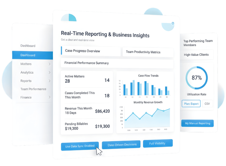- Built-in Reporting & Analytics: Gain real-time insights into performance, utilisation, and case progress.