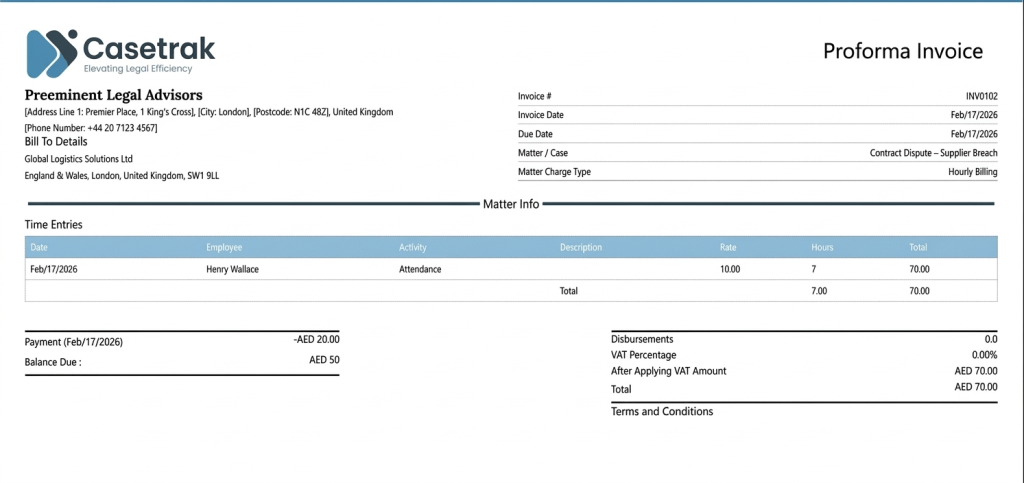 Create professional invoices quickly and manage billing more efficiently with Casetrak. Generate invoices directly from recorded time and expenses, reduce manual work, and support more accurate, consistent billing across your firm.