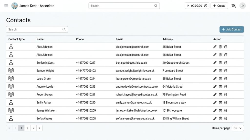 Keep client and contact information structured, accessible, and connected in one organised system. Casetrak helps your firm store detailed profiles, communication history, and related records in one place, making it easier to access the right information, support better communication, and maintain strong professional relationships.